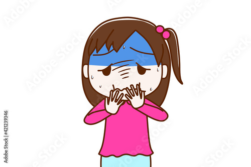 食べ過ぎて気持ち悪くなり冷や汗をかく少女