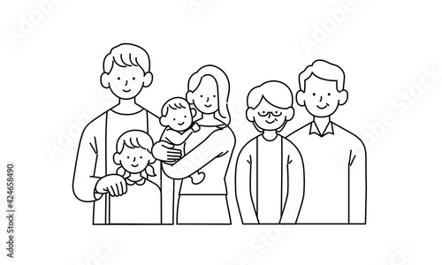 寄り添う笑顔の家族の単色イラスト
