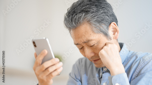 スマートフォンの操作に悪戦苦闘するシニア男性