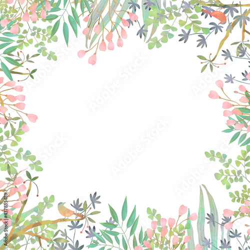 優しい色使いの北欧風オシャレな植物と鳥の白バックフレームイラスト素材