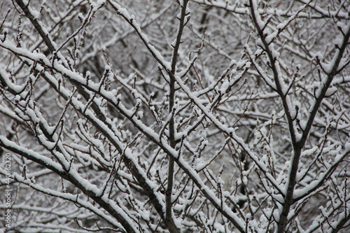 木々の枝葉に雪が積もっている冬の風景