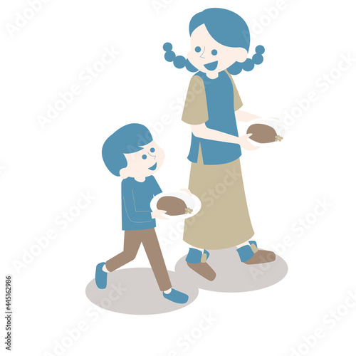 お皿に乗ったお肉を運ぶ親子のアイソメ
