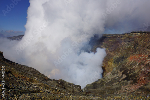 연기를 뿜어내는 구마모토 아소산의 분화구