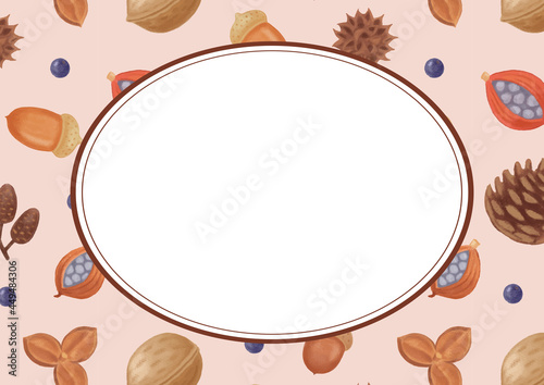 手描き色鉛筆 ナチュラルかわいい 秋の木の実の背景とフレームテンプレート ピンク