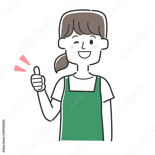サムズアップをしているエプロンを着た店員