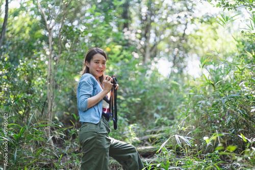 カメラを持って散策する女性