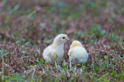 秋の公園の芝生で遊んでいる可愛いヒヨコの姿