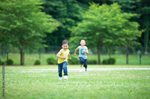 緑の芝生を元気よく走る男の子の兄弟