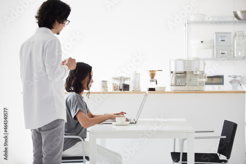 ダイニングキッチンでパソコンをする男女