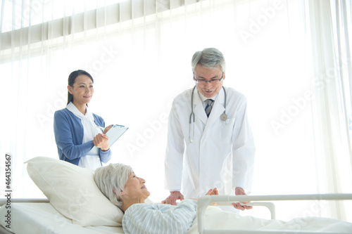 病院ベッドの老人を診察する医者と看護師