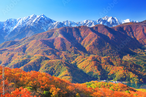鹿島槍ヶ岳と五竜岳と紅葉の樹林, 日本,長野県,大町市