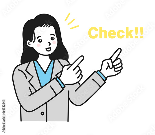 両手で指差してポイントを紹介する女性のイラスト素材