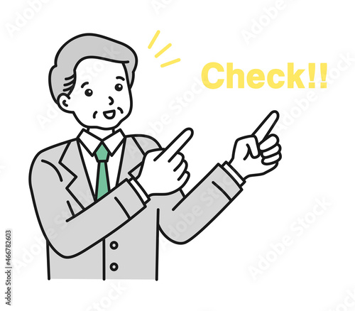 両手で指差してポイントを紹介する年配男性のイラスト素材