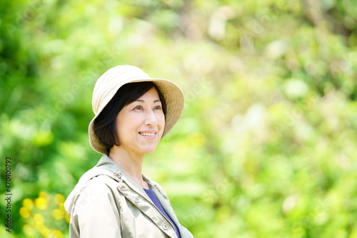 緑の中で帽子をかぶって立つ笑顔の中年女性 ポートレート