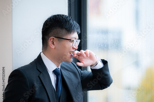 성공한 느낌으로 보이는 빌딩에서 밖을 바라보며 웃는 정장의 사업가 복사 공간 있음