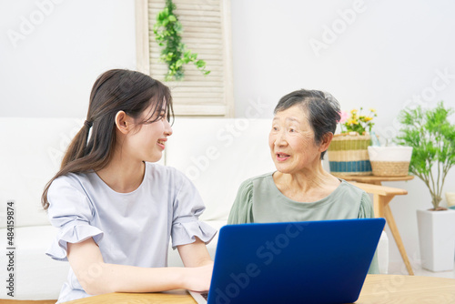 孫と祖母 パソコン 会話 リビング