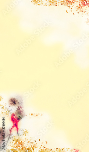 ヴィンテージタイルの雲に広重のコンゴウインコと松のフレーム背景イラスト縦型カラフル系