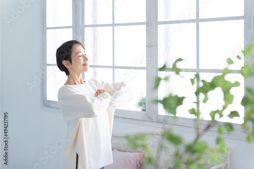 ミドル女性・笑顔・伸び・ストレッチ・健康・ヘルスケア