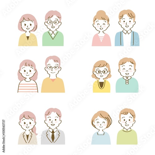 イラスト素材セット:笑顔で仲良く正面を向いた若い男女夫婦、パートナー(バストアップ/手描き線)