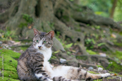 日本の森でリラックスする野良猫