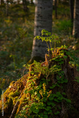 新しい生命が芽吹く森の倒木。原生林の倒木更新。