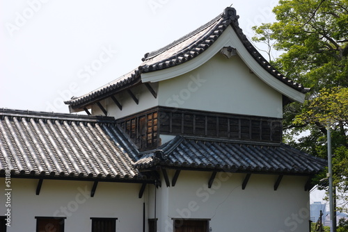 緑に囲まれた福岡城跡。石垣や塀などの歴史的建造物。福岡城は舞鶴公園と大濠公園にある。日本、福岡県
