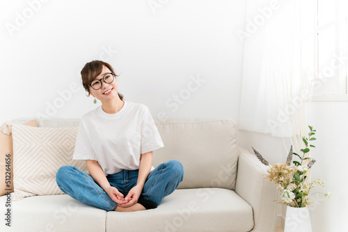 家のソファに座る眼鏡をかけたデニム姿のおしゃれな日本人女性(リラックス)