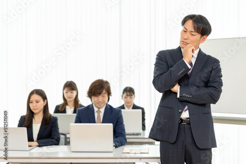 セミナーの男性講師とスーツ姿の男女(悩む)