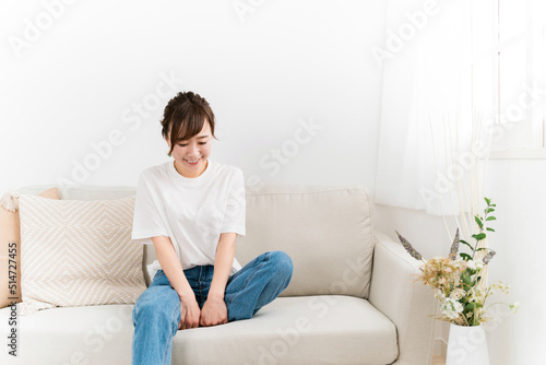 家のソファに座る笑顔の日本人女性(うつむく・照れる)