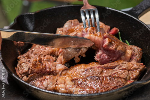 スキレット鍋で焼いたステーキ肉をナイフとフォークを使って食べる