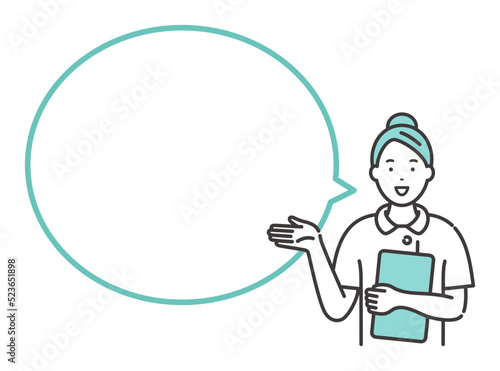 笑顔の若い女性看護師と吹き出し メッセージ用スペース