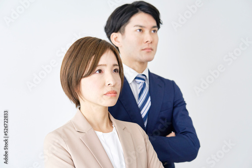 白背景に腕組みをして立つビジネスウーマンとビジネスマン