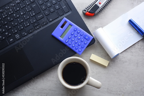 コーヒーを飲みながらノートパソコン(黒)で仕事をする