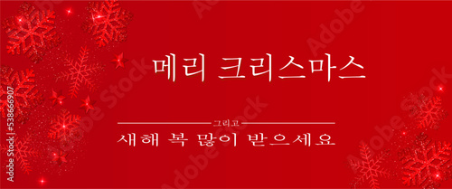 메리 크리스마스와 해피 뉴 이어의 카드 또는 배너는 양쪽에 눈송이, 별, 빨간 장식 조각이 있는 빨간색 배경에 흰색