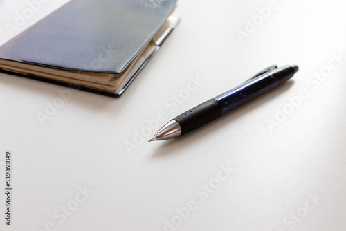 白いテーブルの上に黒の手帳と黒のボールペン