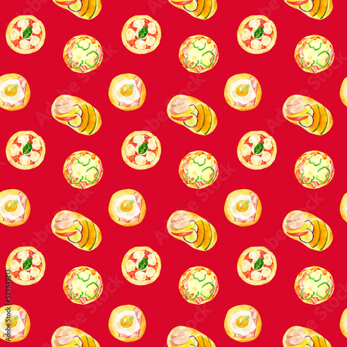 惣菜パンのパターン 手描き水彩イラストの食べ物柄テキスタイル