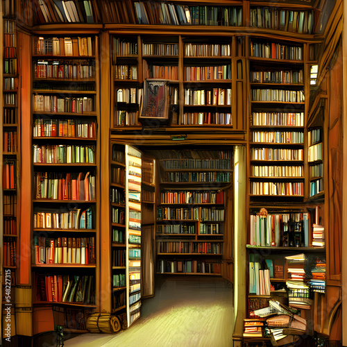 図書館や本屋といった本が棚にたくさん並んだ風景のイラストです。