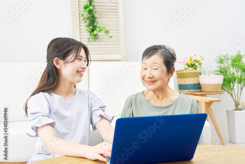 家でパソコンを使うを使う孫と祖母