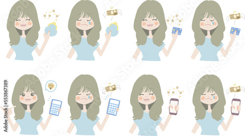 【お金イラスト/お財布、カード、電卓、スマホを持っている女の子】表情とポーズのバリエーションセット
