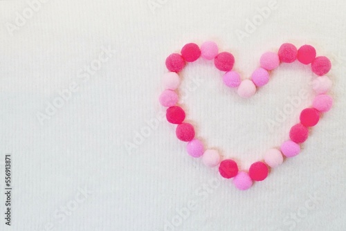 暖かそうな布地の白背景に赤系の毛玉のぼん天で作ったハートの形のバレンタインイメージ