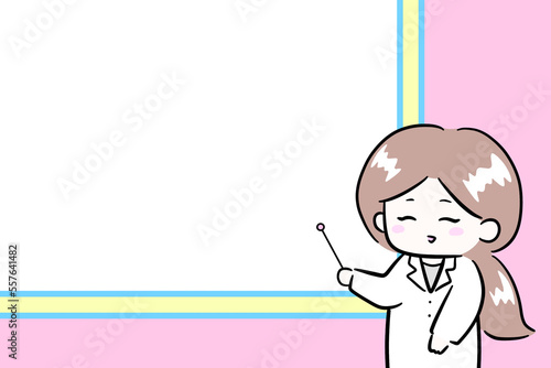 白衣を着て説明をする女性 指示棒を持つ女性 イラスト 余白スペース コピースペース 医師 白衣