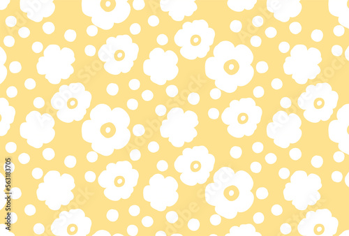 ナチュラルな白の花柄と水玉の黄色の壁紙