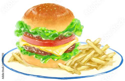 おいしそうなハンバーガーとポテトの水彩イラスト