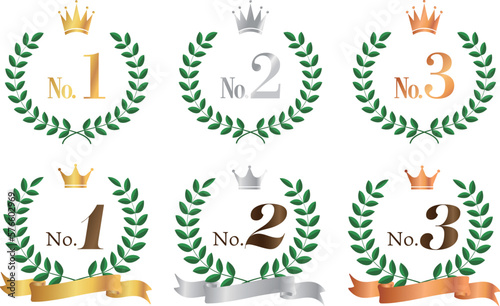月桂樹と王冠とリボンのランキングマーク アイコンイラストセット