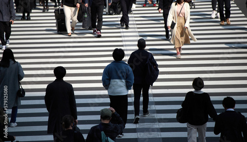 都会の横断歩道を渡る大勢の人の姿