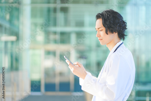 病院の廊下でスマートフォンを操作するスクラブを着た若い男性医師