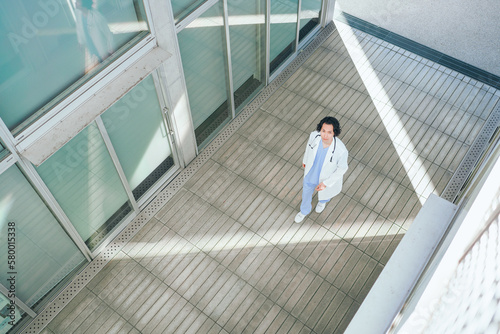 病院の廊下を歩くスクラブ白衣を着た若い男性医師