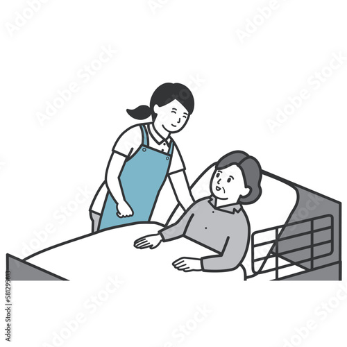 ベッドのシニア女性に微笑む女性介護士のイラスト