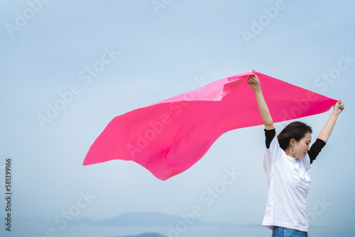 青空の中でピンクの布を持った女性