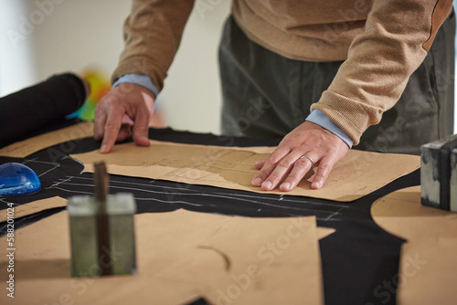 밑그림을 그린 원단에 패턴지를 올리고 작업하는 재단사의 손